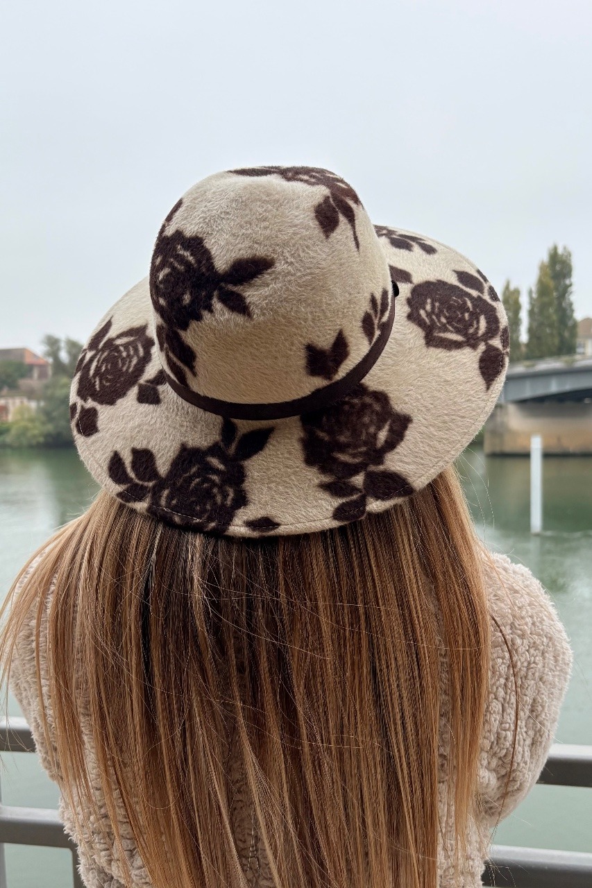 Chapeau d’hiver femme en feutre de velours beige à fleurs